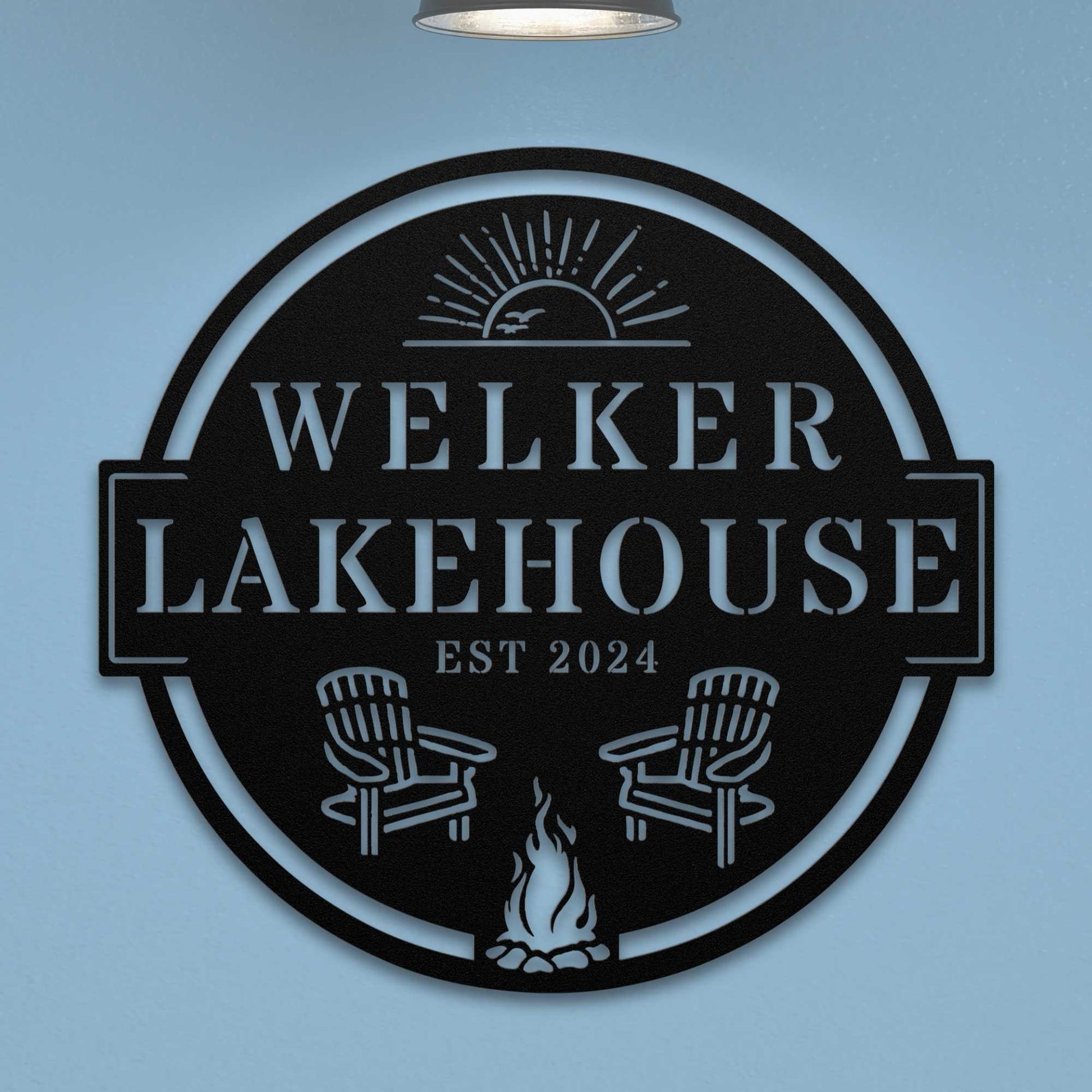 Imbue your lakehouse with the warmth of a sunset view, fire, and cozy chairs with this custom sign. It's an idyllic representation of lake life, personalized with your family name and the year established.